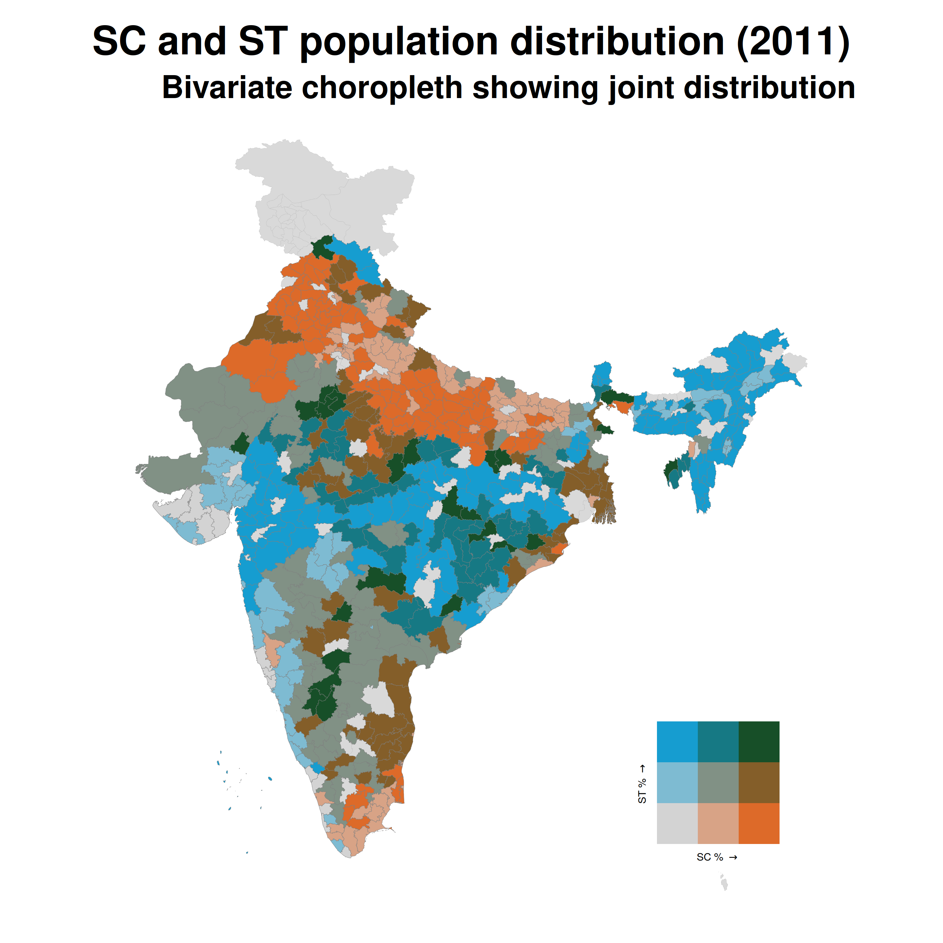 #> 5 Arunachal Pradesh 64.2Bivariate choropleth: SC and ST together