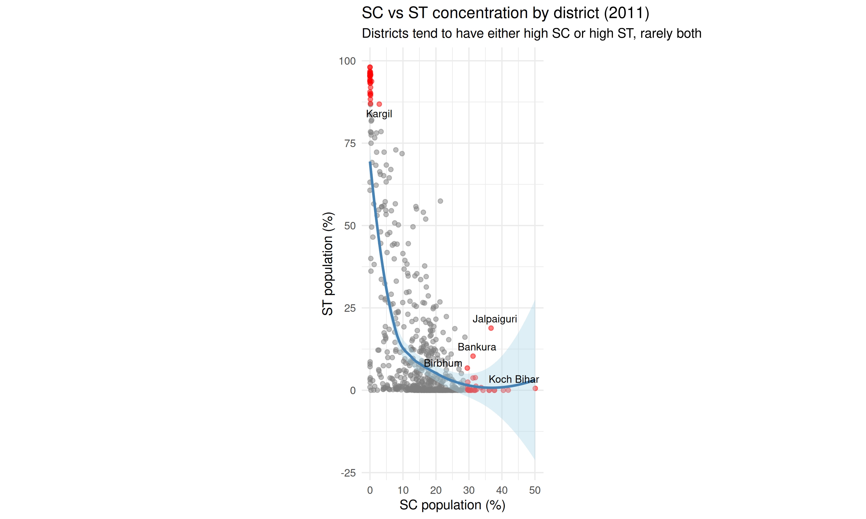 subtitle = "Districts tend to have either high SC or high ST, rarely both"