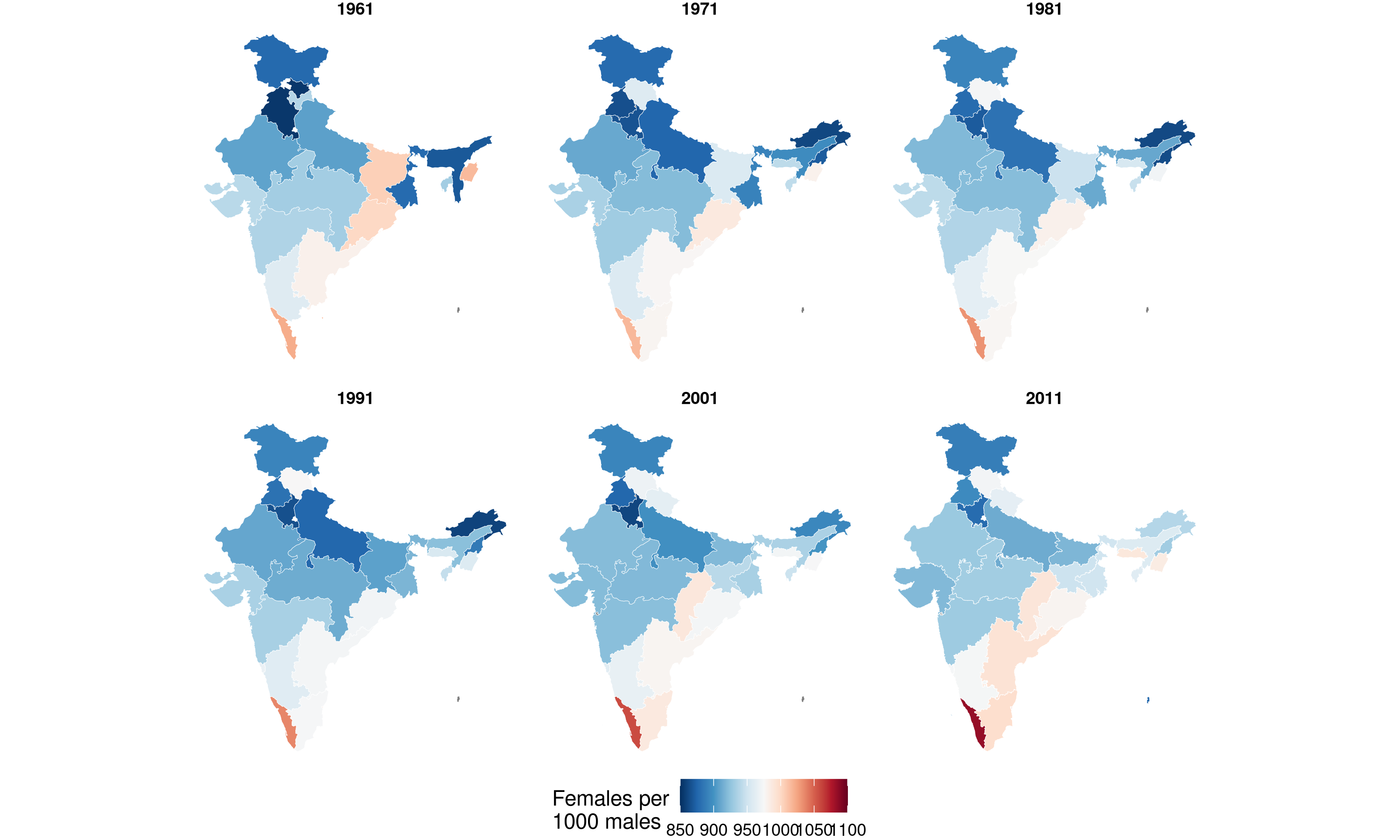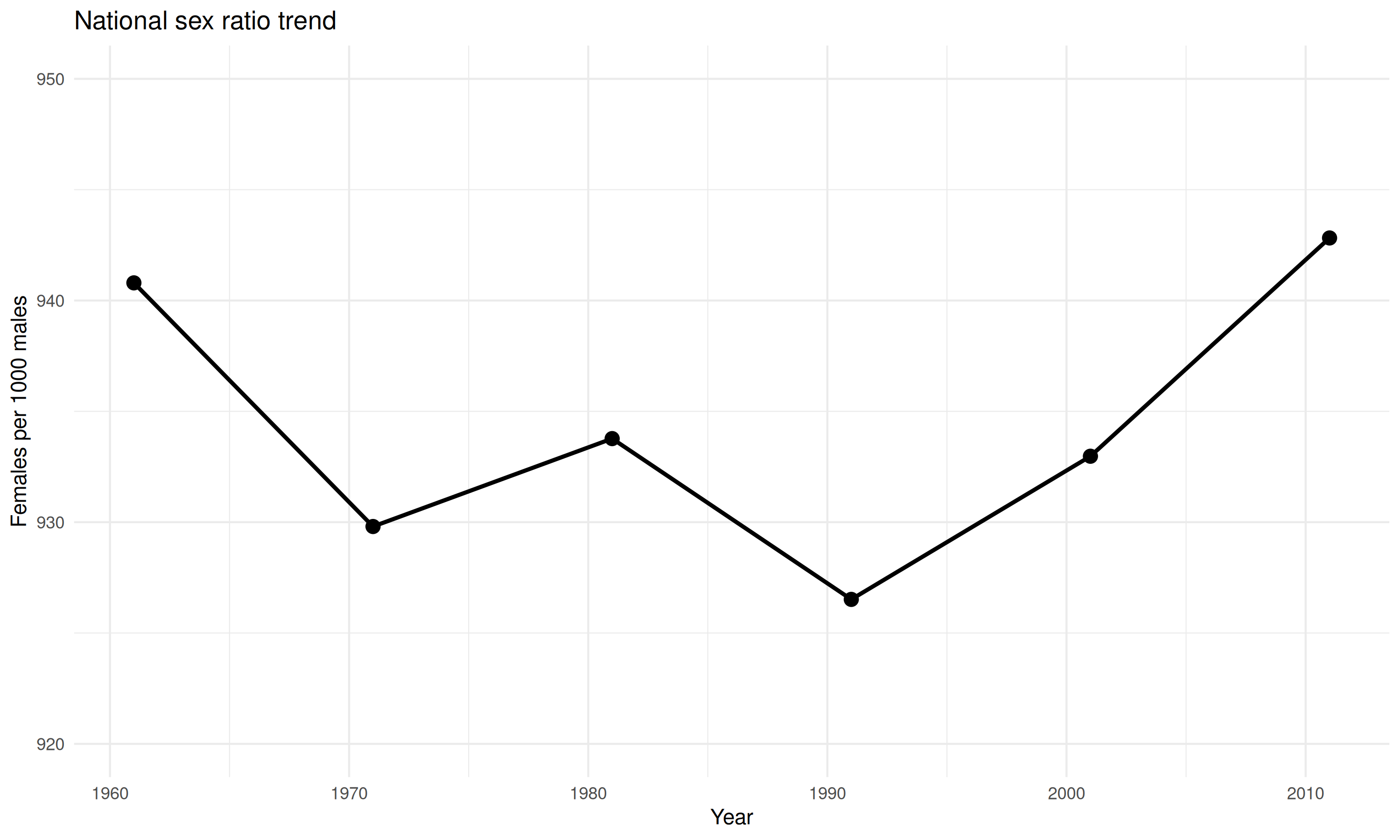labs(x = "Year", y = "Females per 1000 males", title = "National sex ratio trend") +