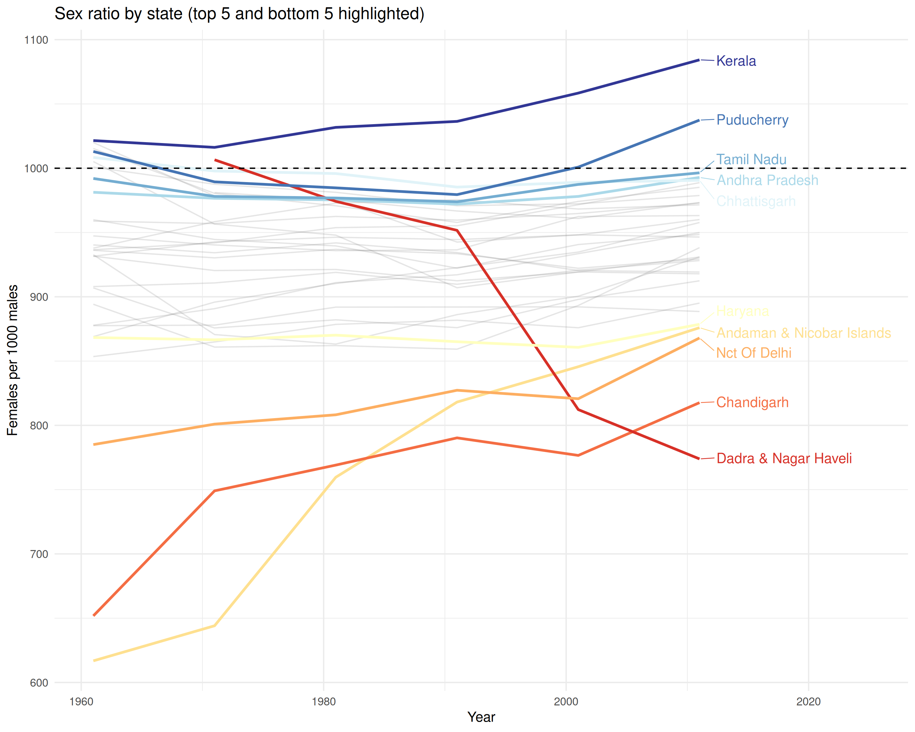 labs(x = "Year", y = "Females per 1000 males", title = "Sex ratio by state (top 5 and bottom 5 highlighted)") +