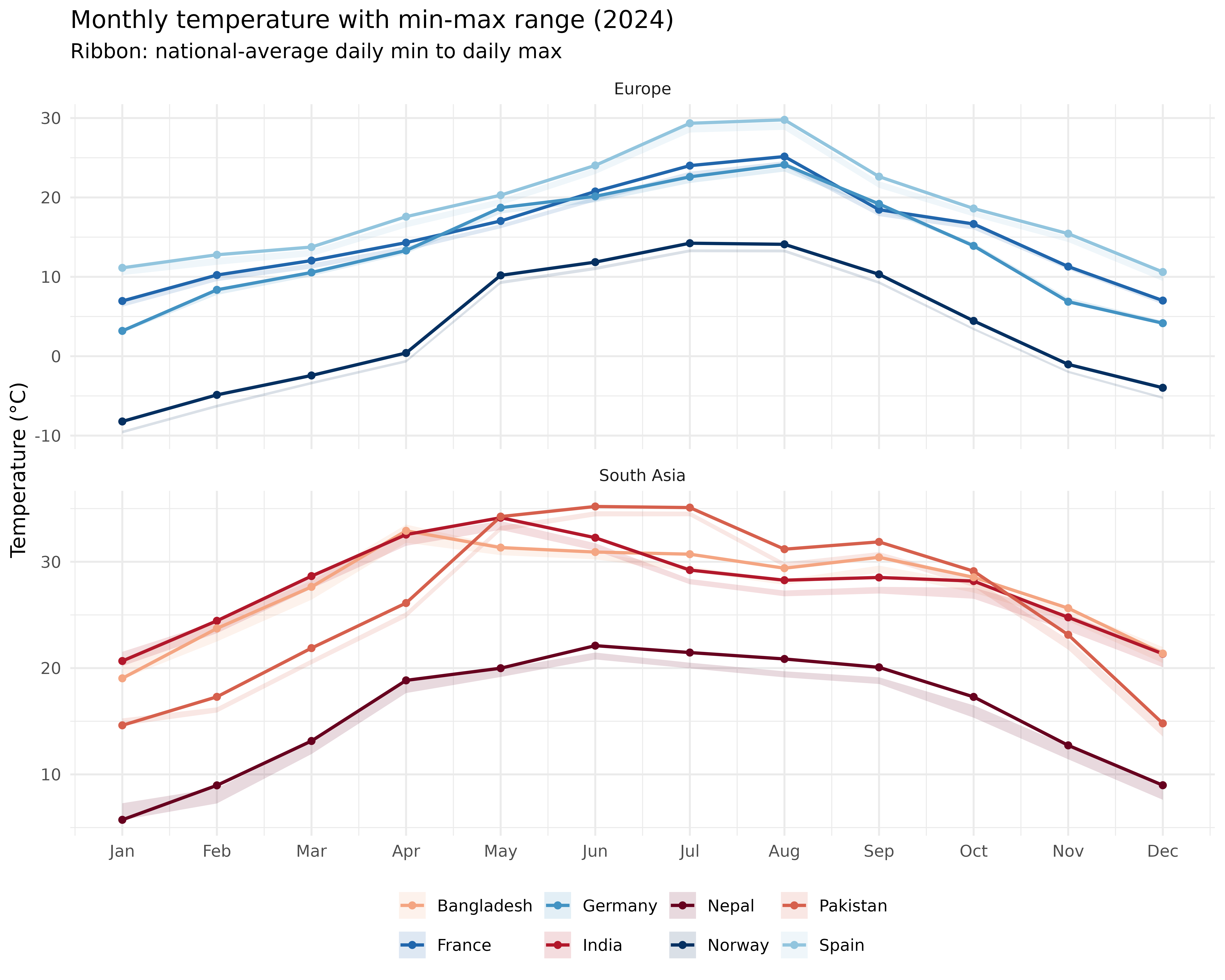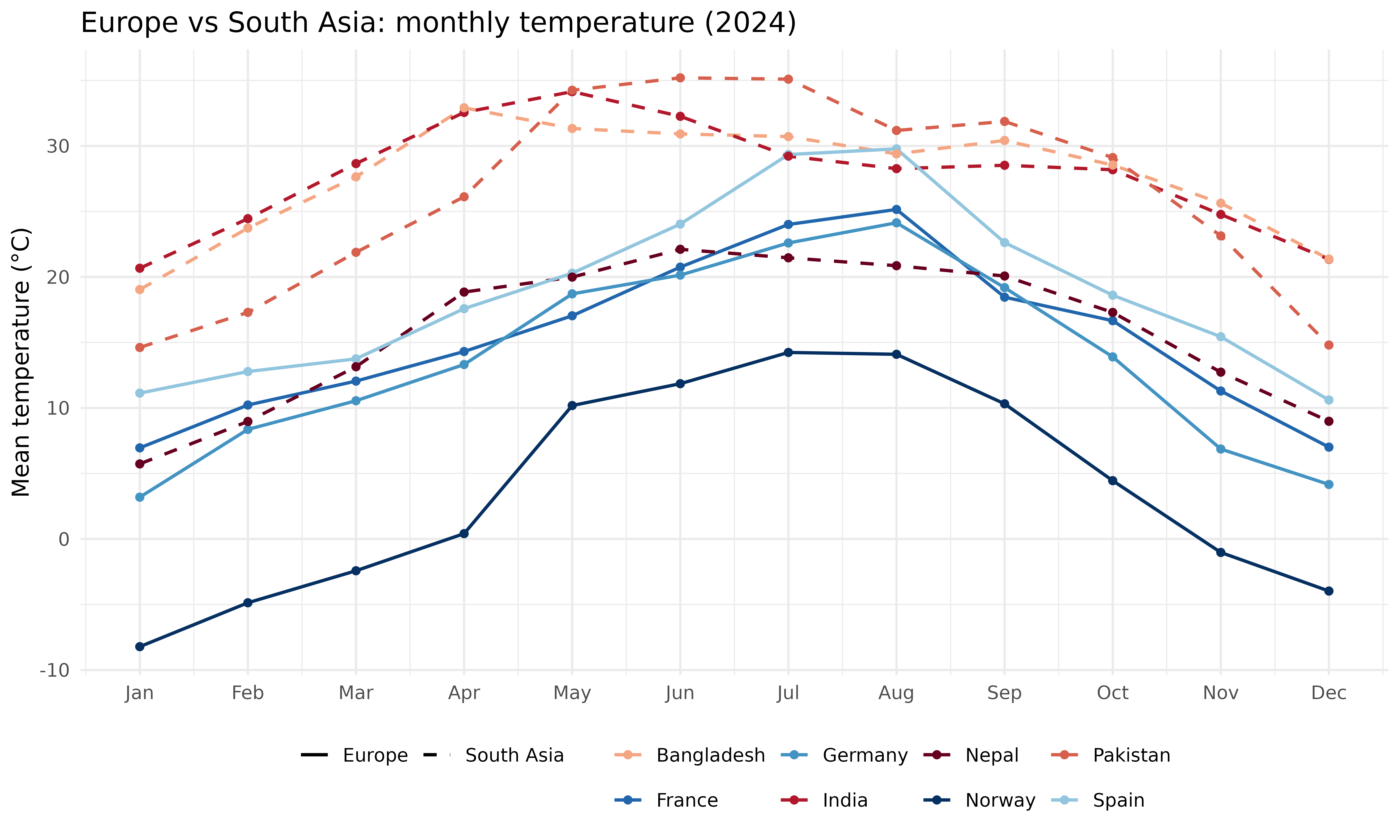 title = "Europe vs South Asia: monthly temperature (2024)",